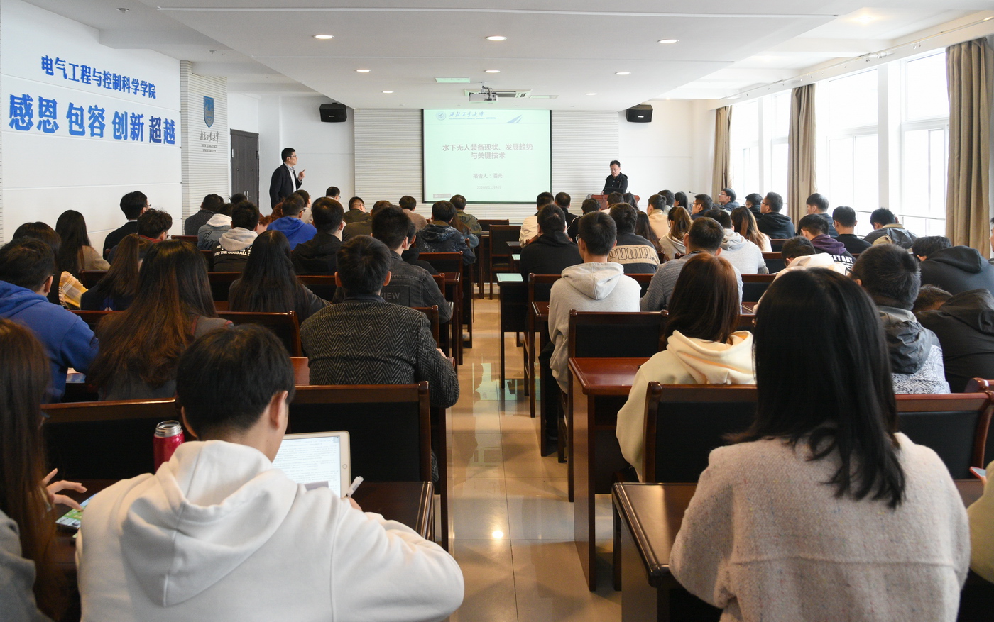 首先,潘院长介绍了目前新形势下发展水下装备发展的重要性,之后对国内外水下无人装备的发展现状、我国对水下无人装备的运用以及关键技术做了详细阐述。报告后潘院长与师生进行了热烈的讨论交流。