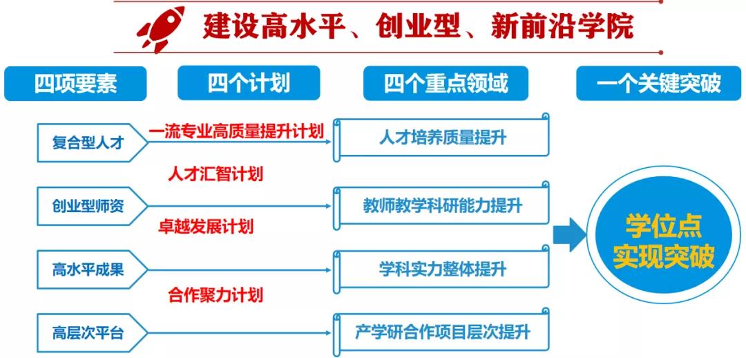 在党建引领下,伟德bv国际1946以建设高水平、创业型、新前沿伟德bv国际1946为目标,紧抓“复合型人才”、“创业型师资”、“高水平成果”、“高层次平台”四个要素,科学实施“一流专业高质量提升计划”、“人才汇智计划”、“卓越发展计划”、“合作聚力计划”四大计划,重点把握“人才培养质量提升、员工教学科研能力提升、学科实力整体提升、产学研合作项目层次提升”四大领域,力求实现“学位点”的关键突破。