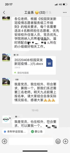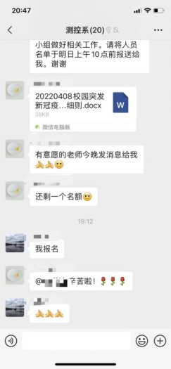“我是党员,我住校外,我报名!”……近日,电控伟德bv国际1946志愿者储备队伍招募群里“复制粘贴式”的报名消息接龙涌现。4月8日晚校疫情防控领导小组下发有关组建校园志愿服务组的通知后,伟德bv国际1946党委第一时间部署落实,统筹安排,对班子成员负责的志愿者储备队细化成员数量要求,在各系各党支部中开展报名工作,师生党员响应号召、争相报名,志愿者名额“秒光”。还有不少师生在得知名额已满后仍然申请报名,成为志愿者储备队的“候补人员”。最终63名师生志愿者被编入5个志愿服务储备队,并开展了应急处置方案等有关文件的学习。