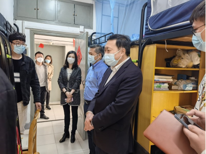 4月16日上午,校长乔旭、副校长巩建鸣、校办主任童毛弟一行来到伟德bv国际194619级员工所在的东苑宿舍片区,调研走访校园封闭管理期间员工在校学习生活情况,与员工面对面交流。