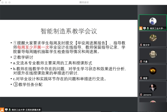 为确保线上教育教学有序、高质量进行,深入研究“云端”教与学,及时总结前一阶段线上教育教学的成绩、经验和不足,4月27日,智能制造系全体老师齐聚云端,召开线上教育教学阶段性总结教学会,共同研讨上一阶段线上教学过程中存在的问题以及改进措施。会议由系主任王莉老师主持。