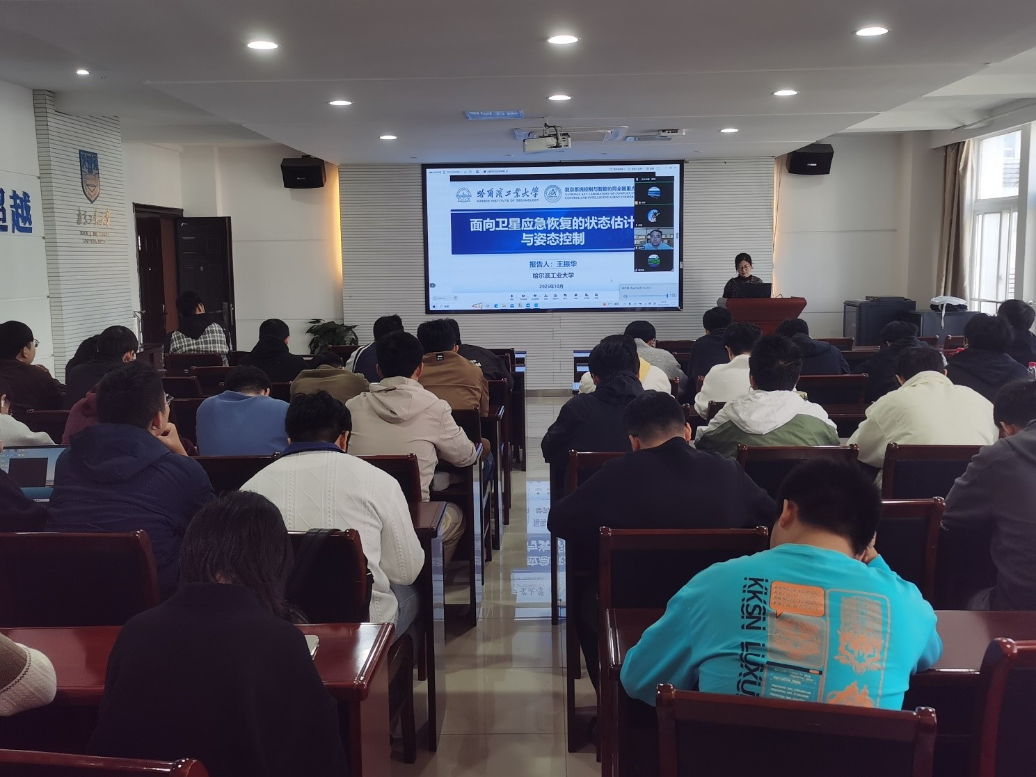 报告中,王振华教授介绍了卫星应急恢复过程中太阳电池阵转角估计方法与卫星磁控对日安全控制的解决方案和关键技术。交流环节中,王振华教授和现场师生就卫星应急恢复过程中的保证能源供应问题与未来发展趋势进行了深入讨论。本次报告让与会师生对航空航天领域前沿方向有了新的认识,受益匪浅。