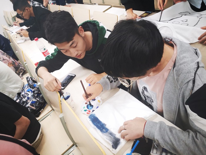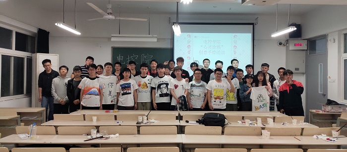 活动前同学们满怀期待,各绘画小组用心构思,都早已有了腹稿,静等活动开始。主持人介绍完活动流程后,工作人员为同学们分发颜料、画笔、调色盘与T恤衫,大家便开始尽情挥洒,大胆构图,细心雕琢。或浓墨重彩、或淡妆轻饰,或抽象、或写实,图画了一幅幅各有特色的作品,也画出了自己心中最美的“风景”。完成了各自的作品后,大家一一上台分享自己的作品的意义与内涵,在一片欢声笑语中,本次心灵涂鸦主题心理活动圆满结束。