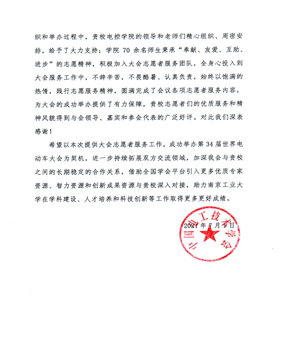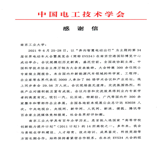 近日,中国电工技术学会向伟德bv国际1946发来感谢信,感谢伟德bv国际1946师生在第34届世界电动车大会暨展览会中做出的贡献。
