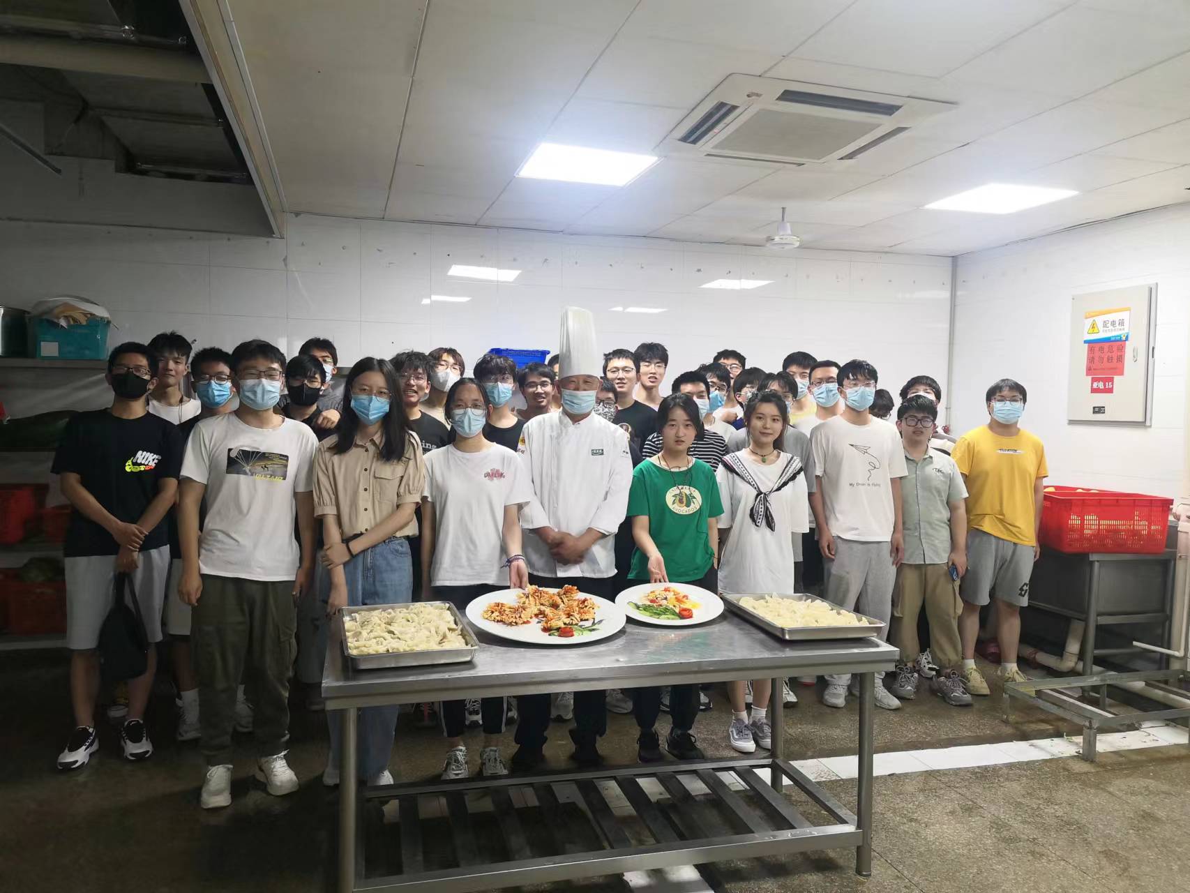 活动伊始,全体同学在工作人员的带领下进入食堂后厨,分成两组亲身体验母亲平日里的不易。第一组同学向厨师师父学习菊花鱼和菠萝鸡的制作,并体验将鱼切片成丝的过程。另一组同学与食堂工作人员一起学包饺子,一边包一边聊起与母亲之间的故事。活动中,每位同学录制“妈妈,我想对你说”的视频祝福。最后,全体同学向宿管、食堂阿姨送出鲜花水果与祝福信,表达对阿姨“妈妈般”关心的感激之情。