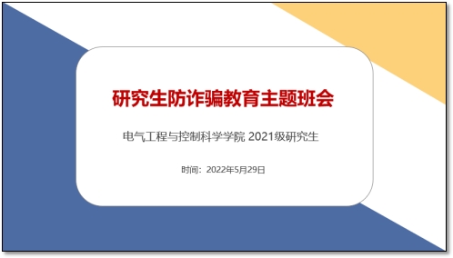 为营造浓厚的校园反诈宣传氛围,进一步提高同学们的反诈防骗意识,电气工程与控制科学伟德bv国际1946各研究生团支部分别于5月27日、5月29日组织开展了“防诈骗教育主题班会”,伟德bv国际19462020级、2021级共250多位研究生参加了主题班会活动。