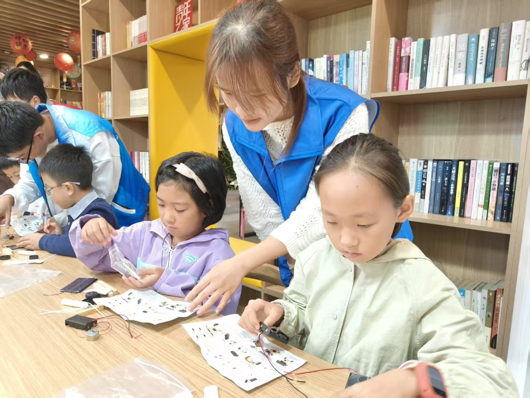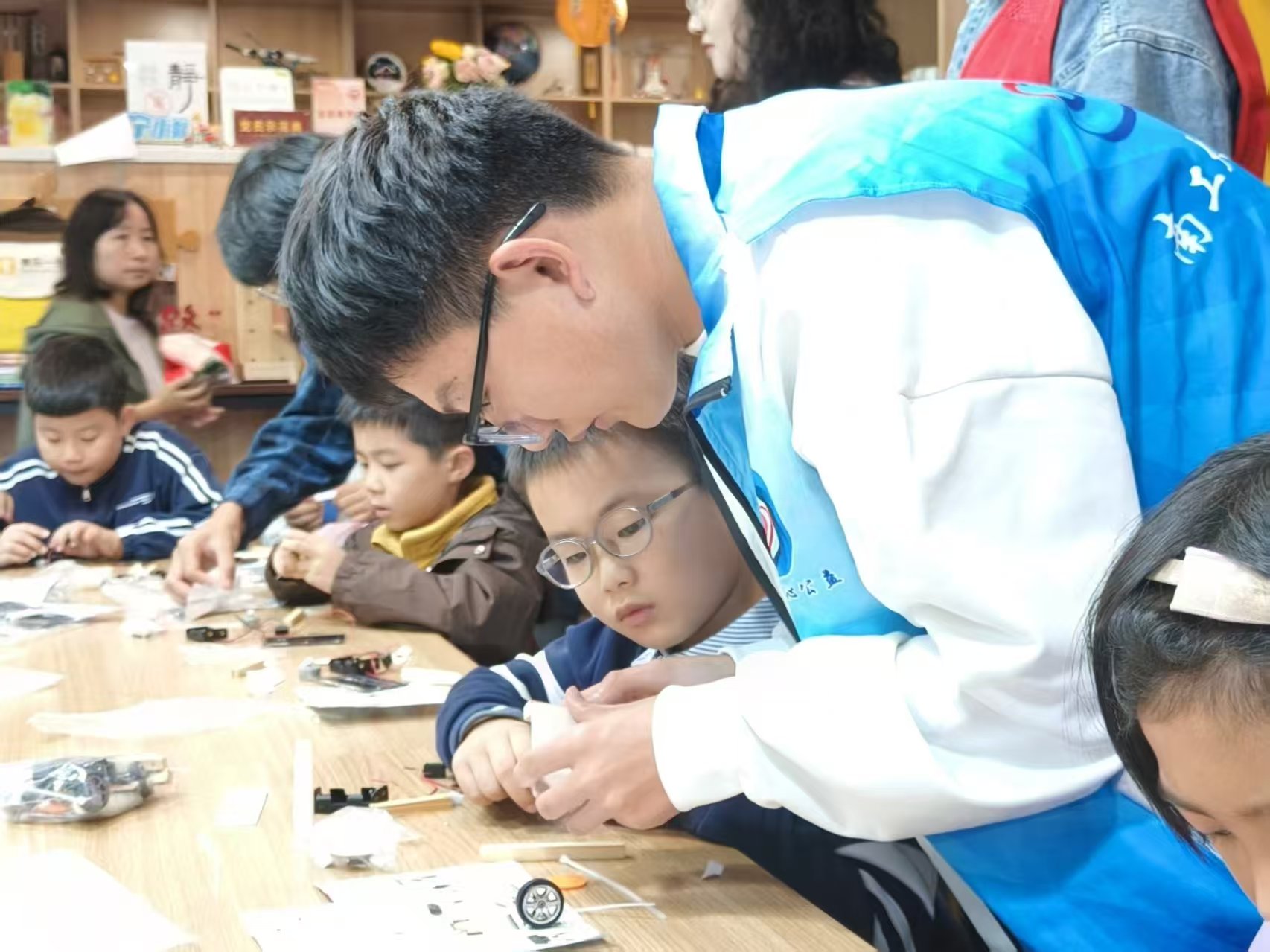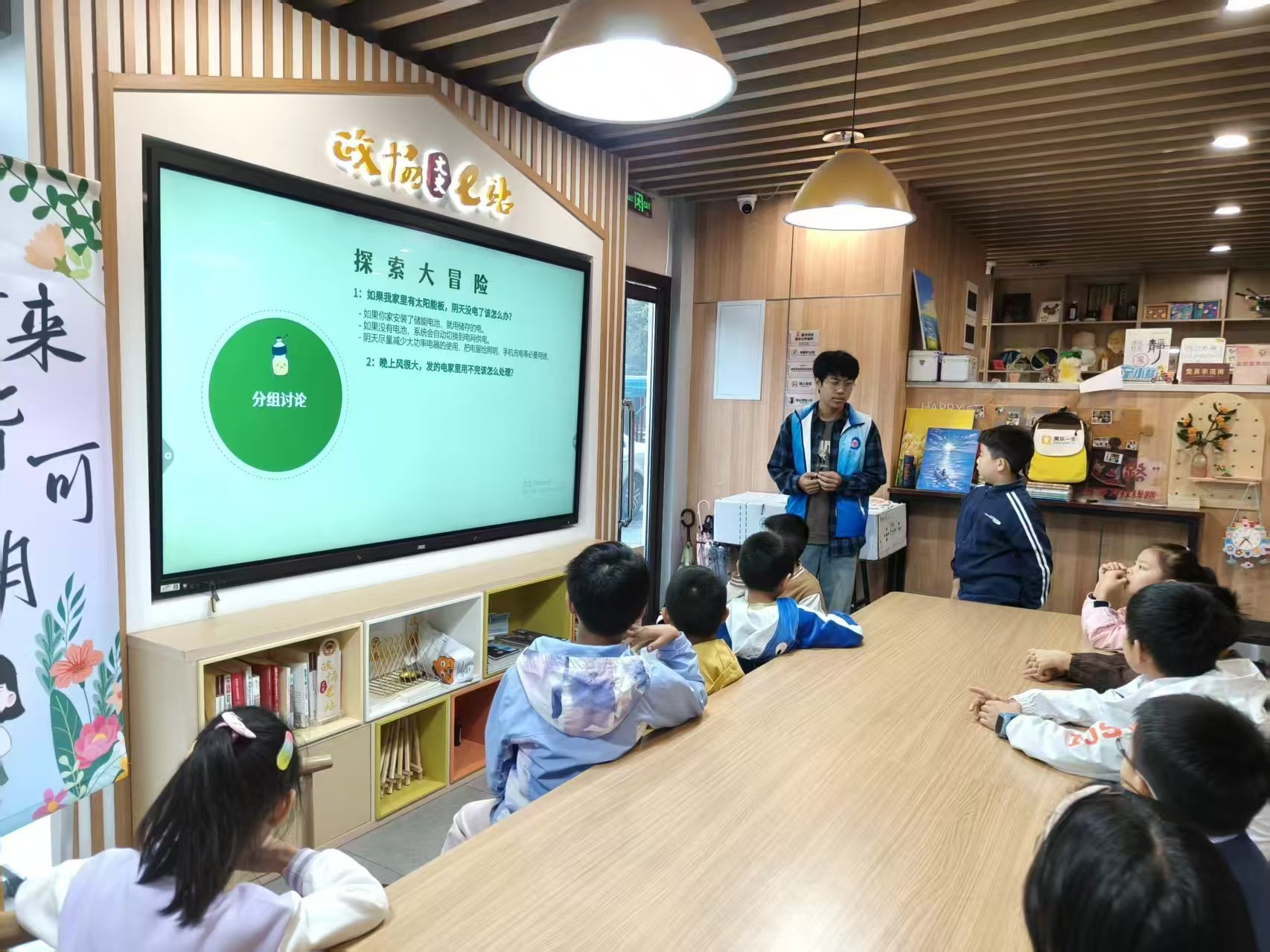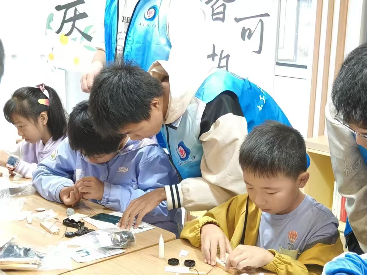 活动中,志愿者将太阳能、风能等清洁能源比作地球的“绿色充电宝”,结合宁夏腾格里沙漠光伏基地的真实案例,生动阐释“风光水储”协同、传统电厂升级与智慧电网建设等“双碳”实践路径,让“为地球戴‘绿色口罩’”的环保理念深入青少年心中。互动问答环节,志愿者抛出“太阳能板阴天供电”“风电过剩利用”等贴近生活的问题,引导孩子们踊跃思辨,在轻松交流中深化对电力环保的理解。志愿者还手把手指导孩子们认识组件、理解原理,最终完成组装,当阳光驱动小车前行时,孩子们脸上洋溢着成就感。