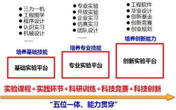 建立了“基础实验”、“专业实验”、“创新实验”三大平台。三大平台涵盖了63个实验室,以此为基础,形成了从低到高、从基础到专业、从知识传授到综合能力培养,逐级提高的实验课程模块,最终形成了“实验课程、实践环节、科研训练、科技竞赛及科技创新”五位一体的实验教学体系。